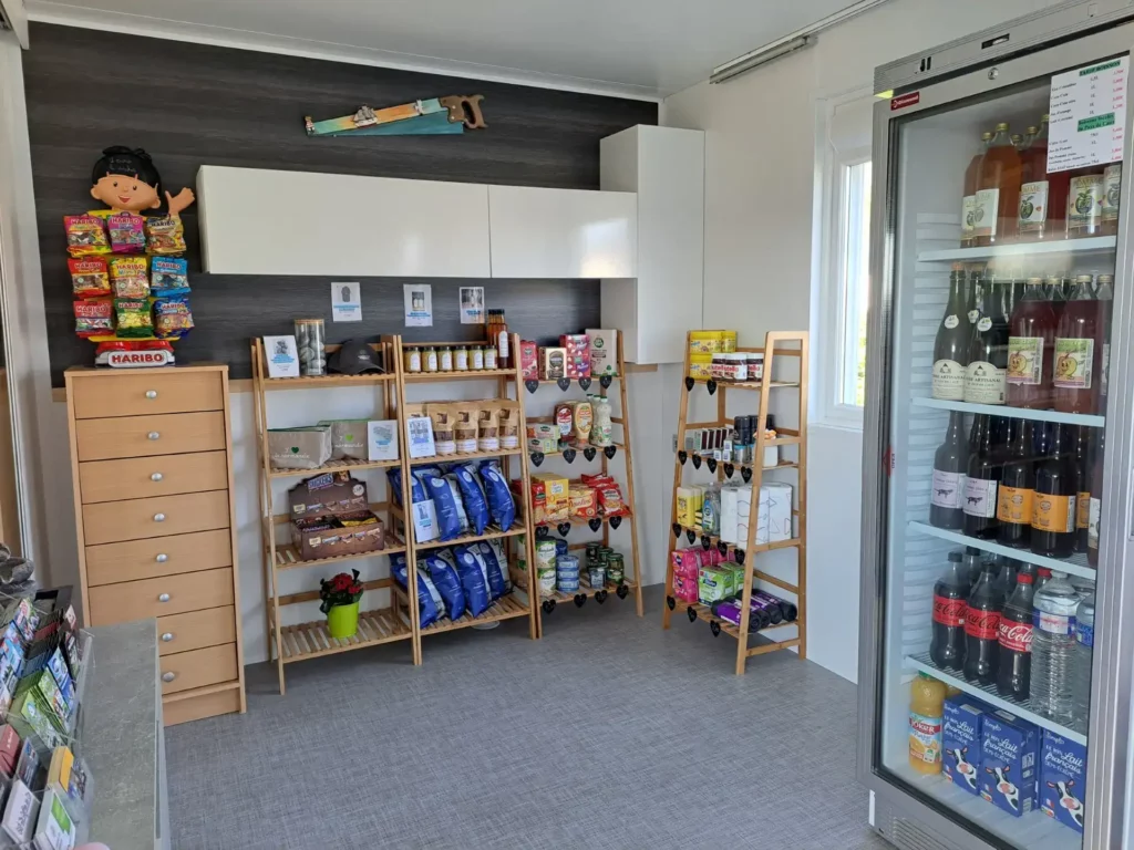 Levensmiddelenwinkel: essentiële producten en Normandische specialiteiten (kaas, cider, zelfgemaakte jam, enz.).
